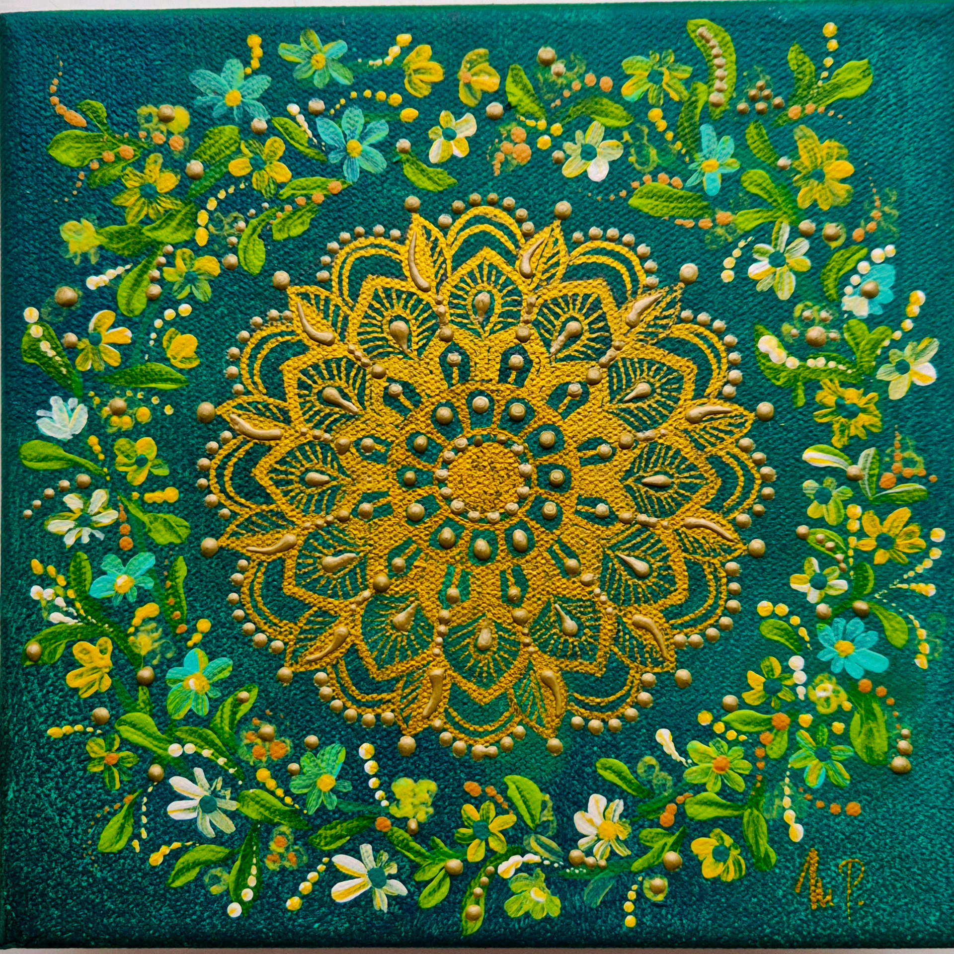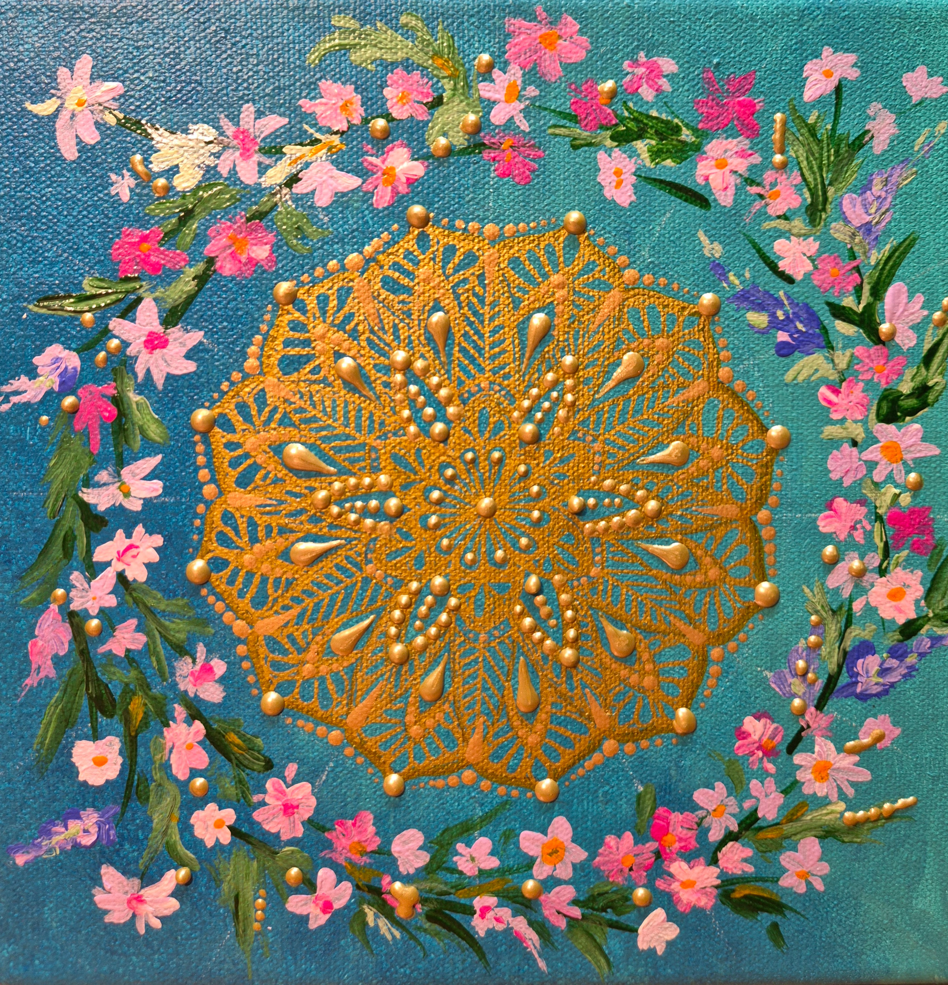 Na plátno 30x30 cm naneseš barevné pozadí v tvých barvám a pak zlatým fixem namaluješ mandalu. Ozdobíš ji květy a lístečky z akrylových barev a tekutými perlami. A pak se budeš kochat tím krásným dílem, které si vytvořila.